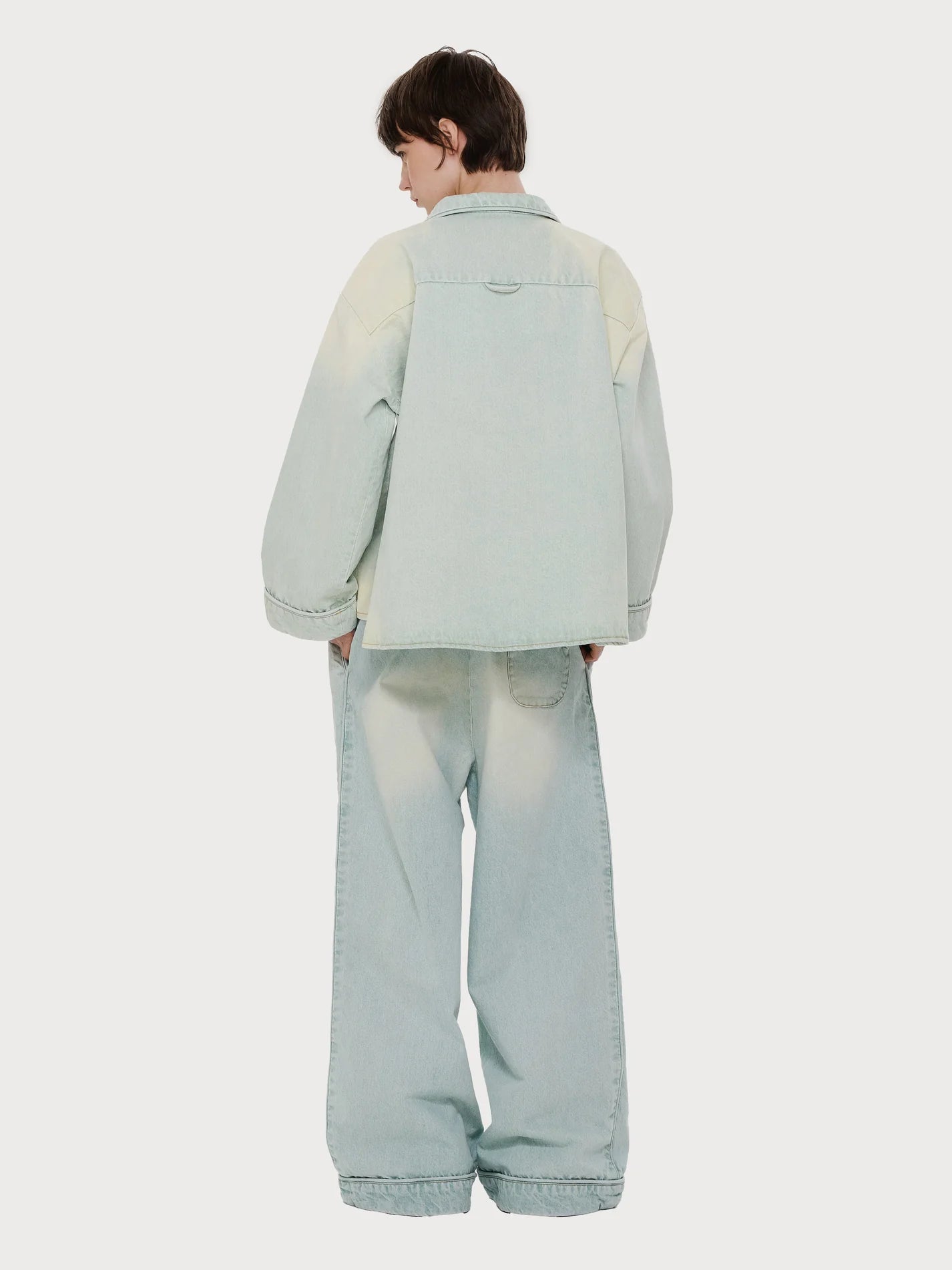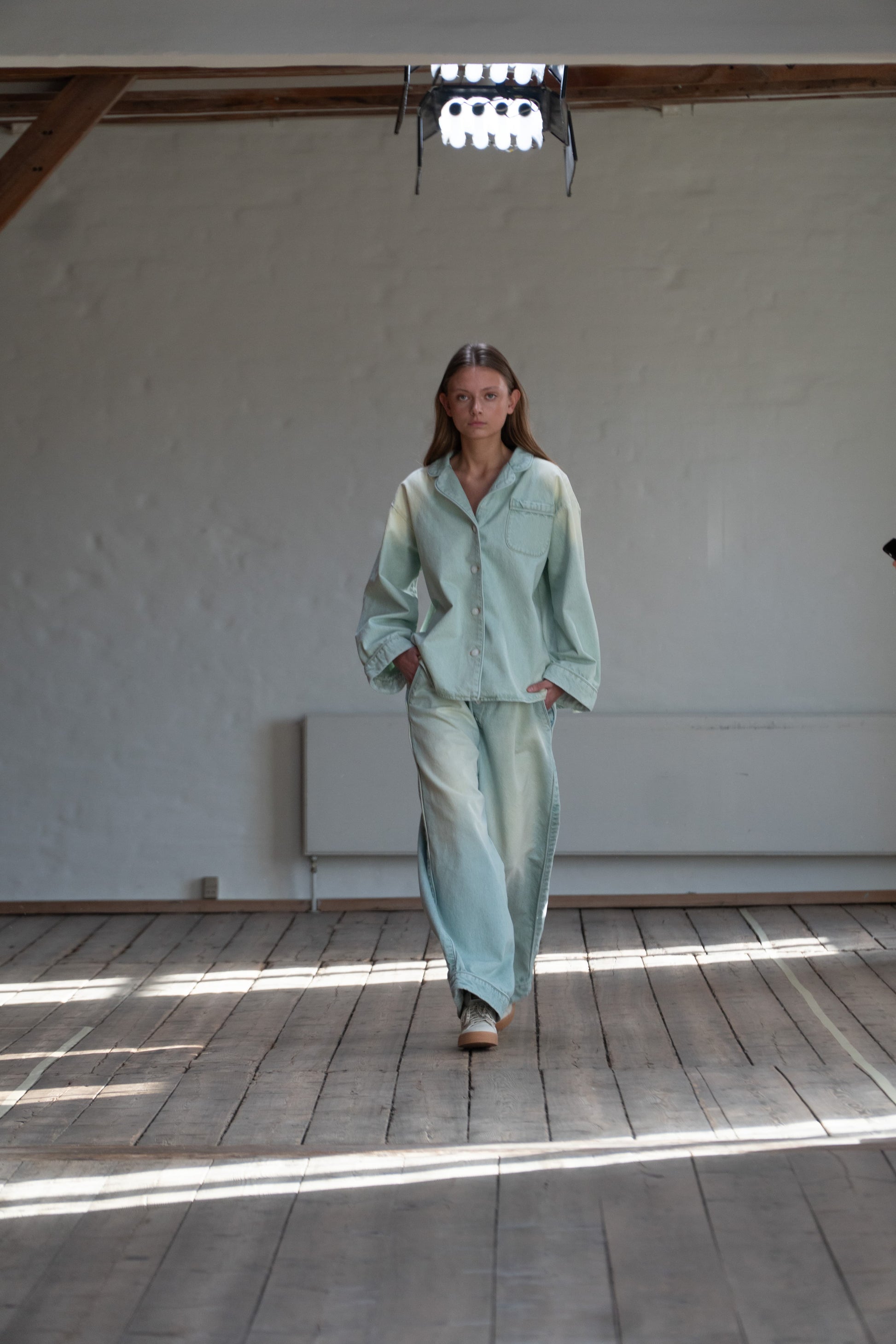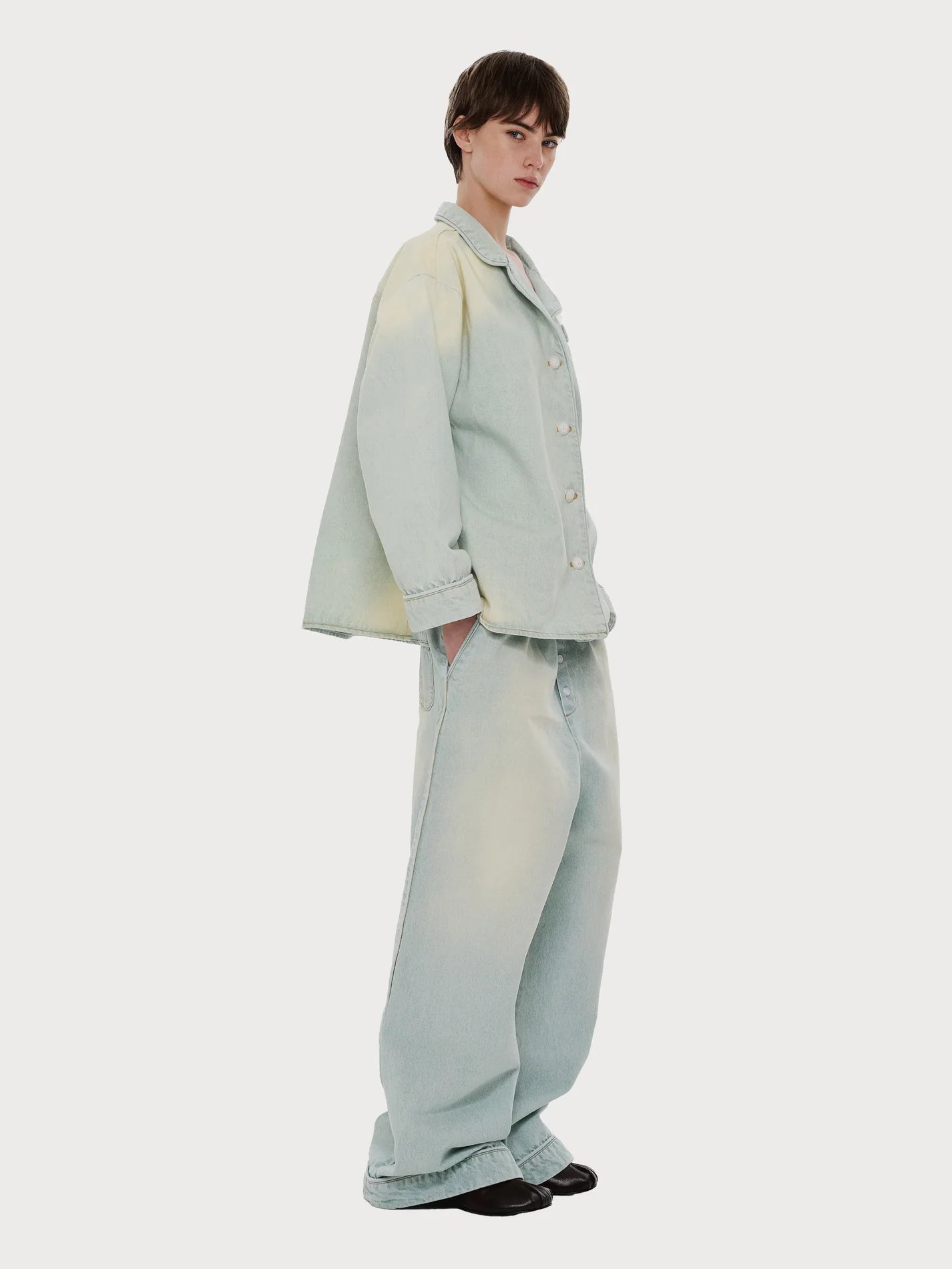 This oversized denim shirt combines the relaxed style of pyjamas with classic denim. Made from 100% cotton in a vintage blue-green shade, it features a button-down closure and drop shoulders. The chest pocket adds practicality, while the oversized silhouette emphasizes a laid-back, cozy look.